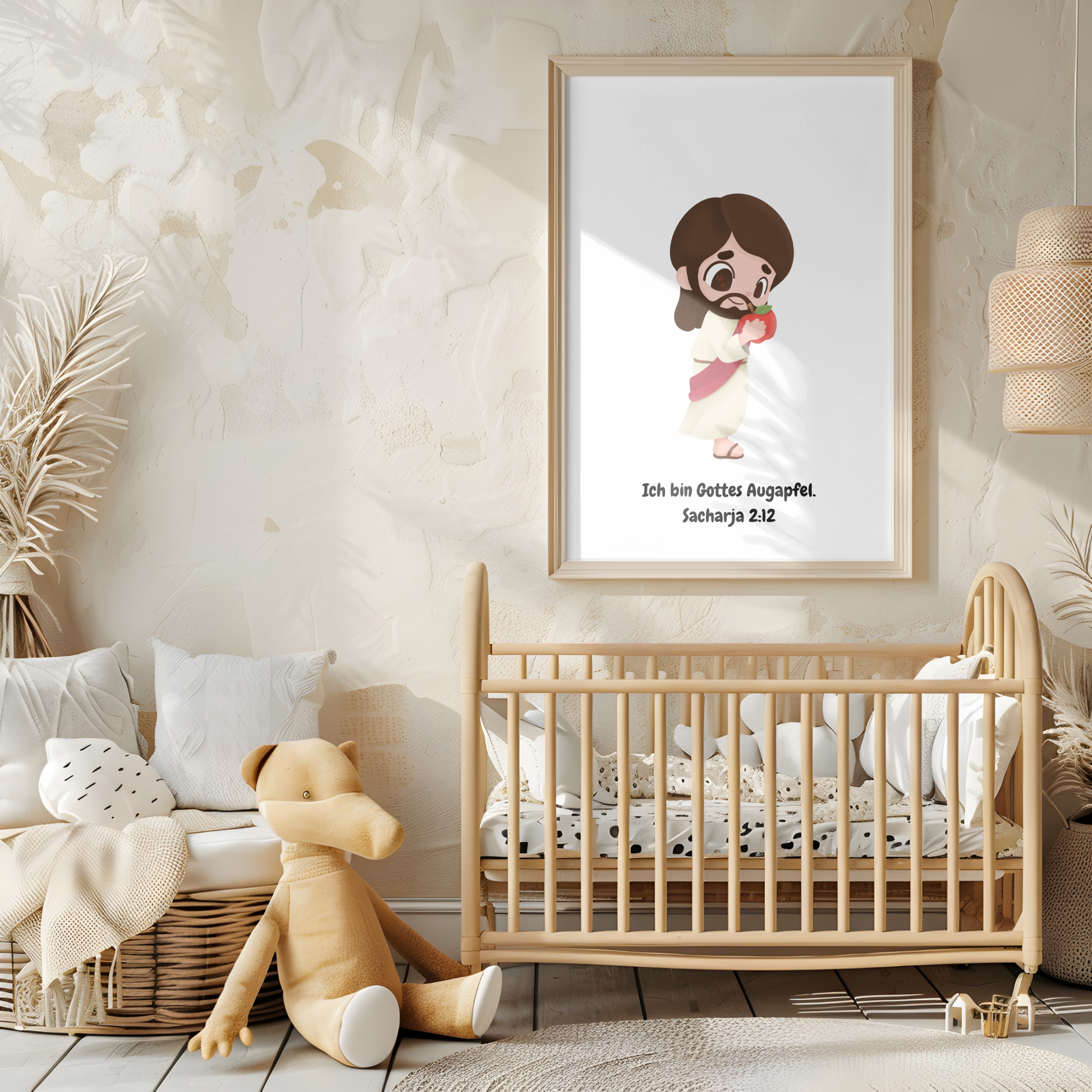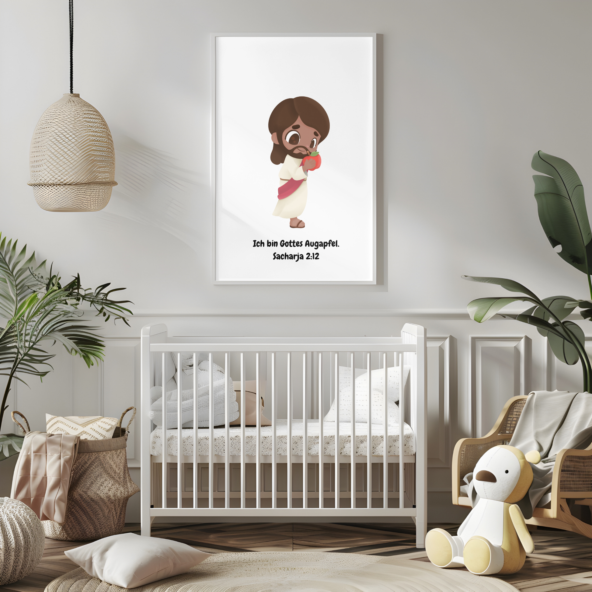 Dieses liebevoll gestaltete Kinderposter zeigt eine süße Jesus-Illustration mit dem Bibelvers aus Sacharja 2:12: „Ich bin Gottes Augapfel.“ Es erinnert Kinder täglich daran, wie wertvoll und geliebt sie sind. Perfekt für das Kinderzimmer, die Sonntagsschule oder als Geschenk zur Geburt, Taufe oder Segnung.