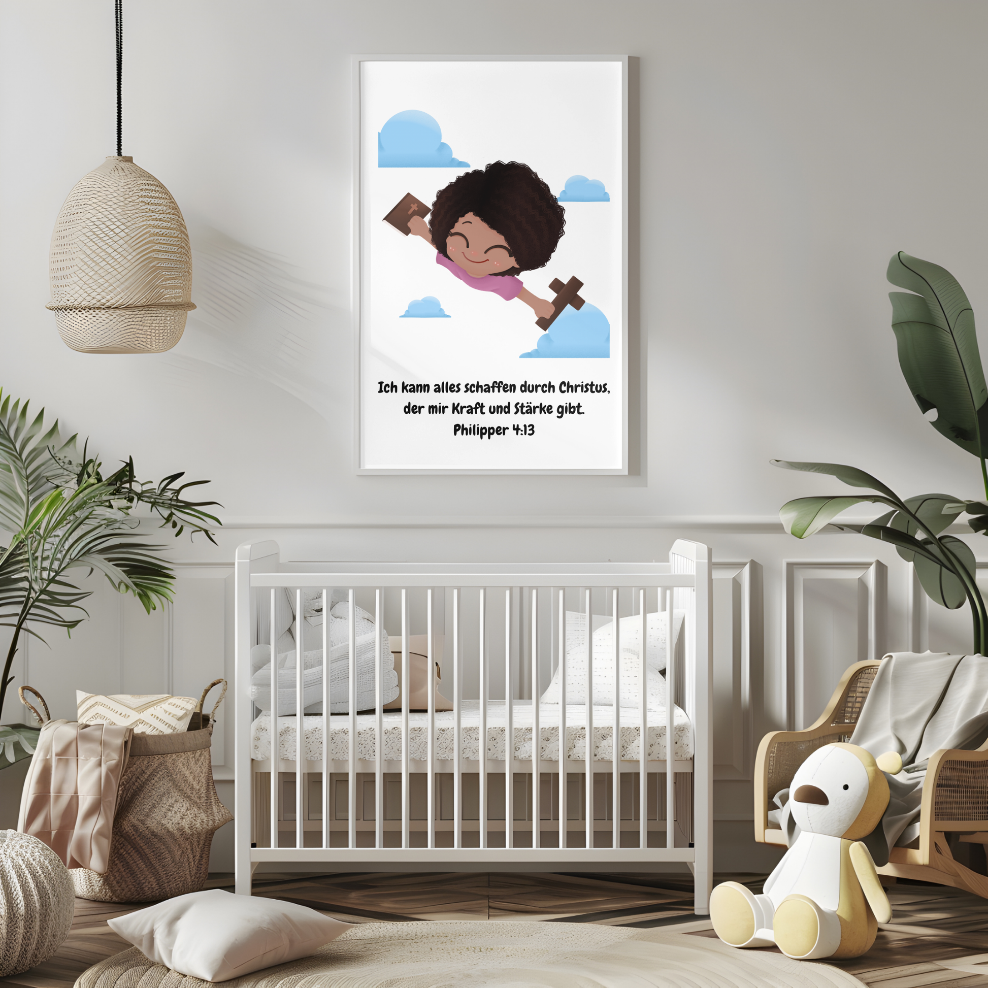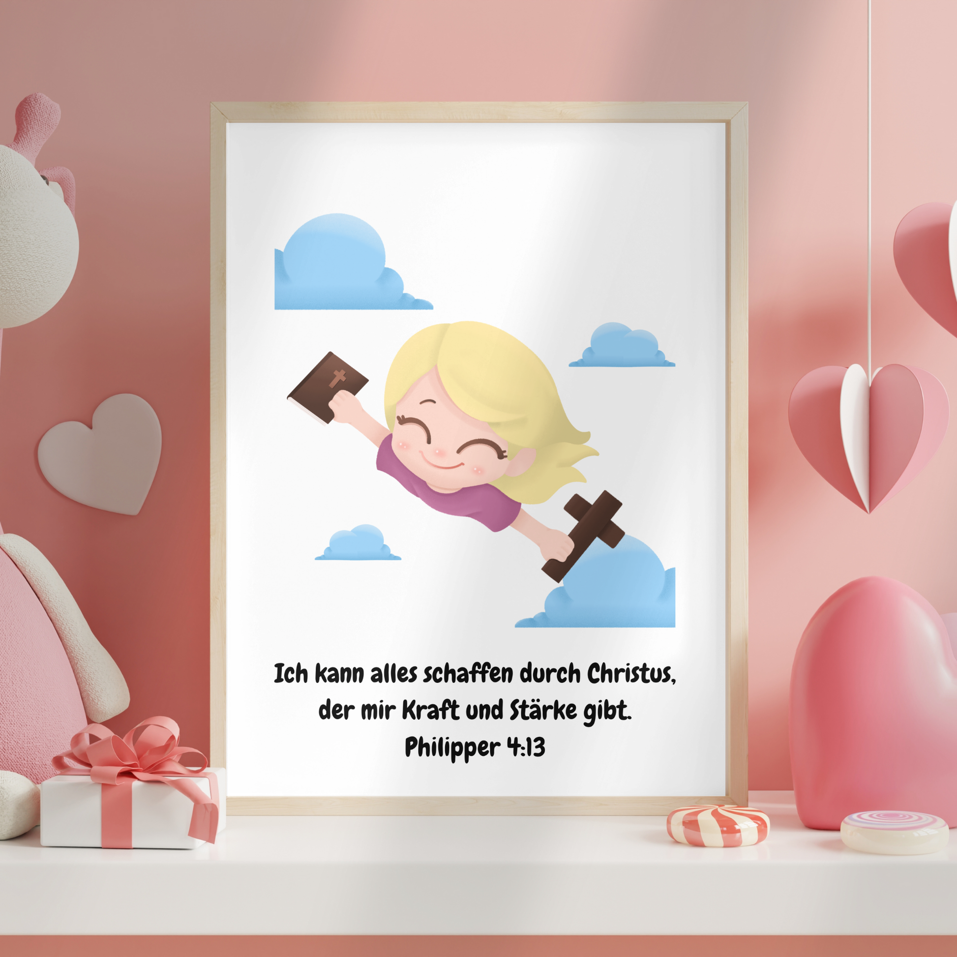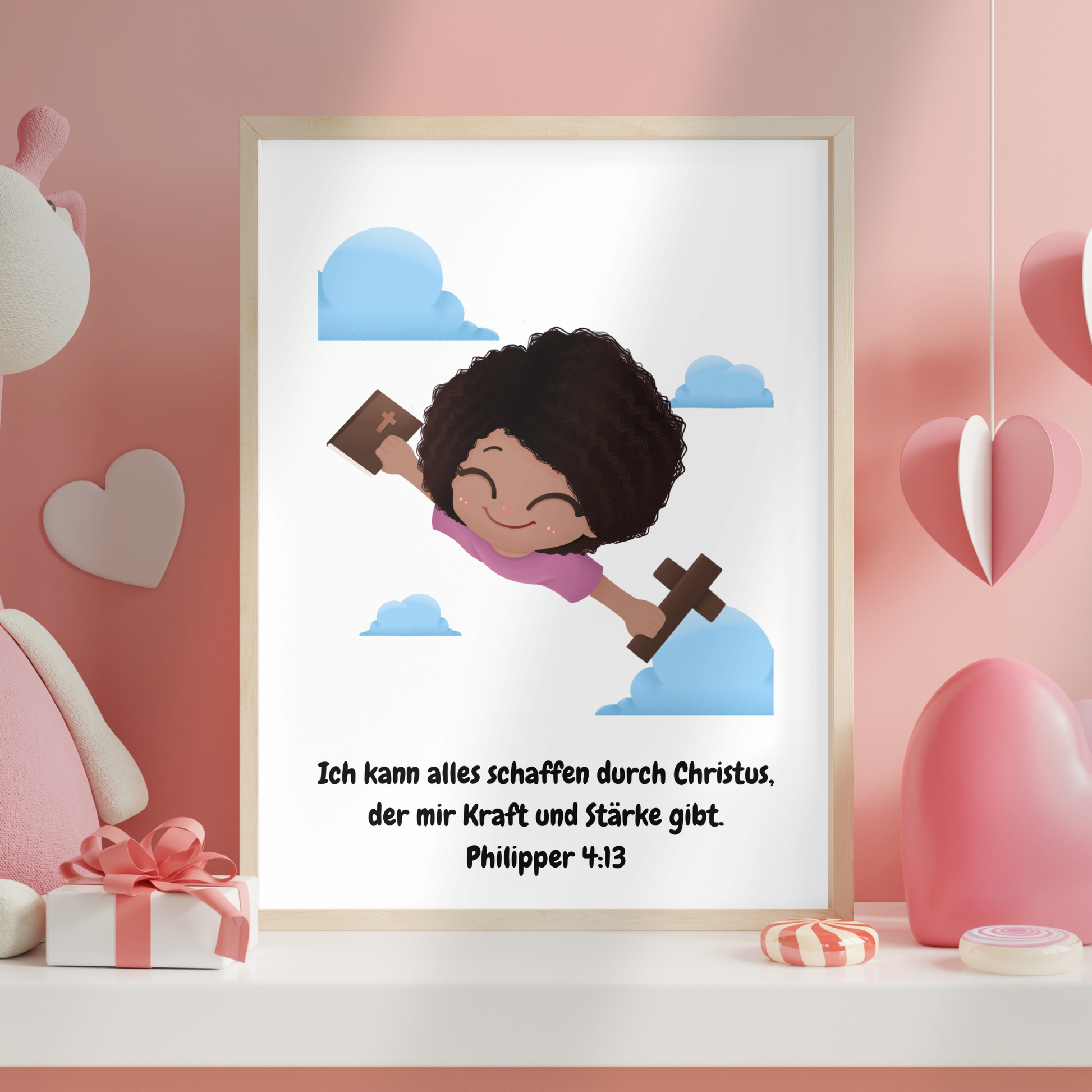 Dieses farbenfrohe Poster zeigt ein fröhliches Kind mit Bibel und Kreuz in der Hand, das durch die Wolken fliegt . Das Poster ist inspiriert vom ermutigenden Bibelvers „Ich kann alles schaffen durch Christus, der mir Kraft und Stärke gibt“ (Philipper 4:13). Ein kraftvolles Statement für kleine Herzen, das Mut macht und den Glauben im Alltag stärkt.