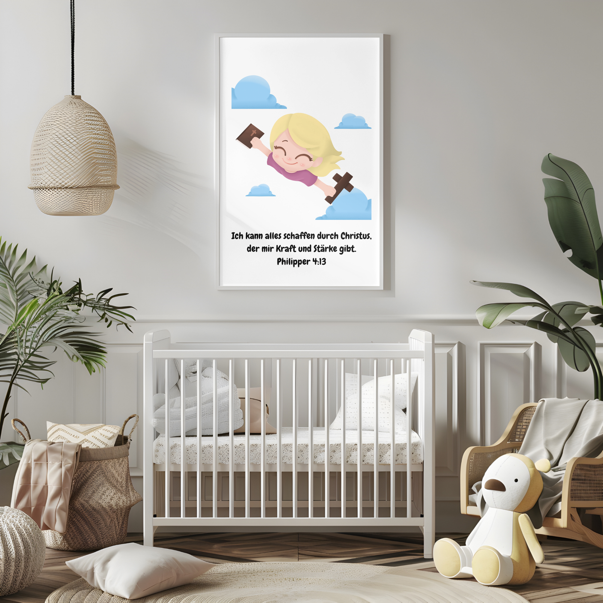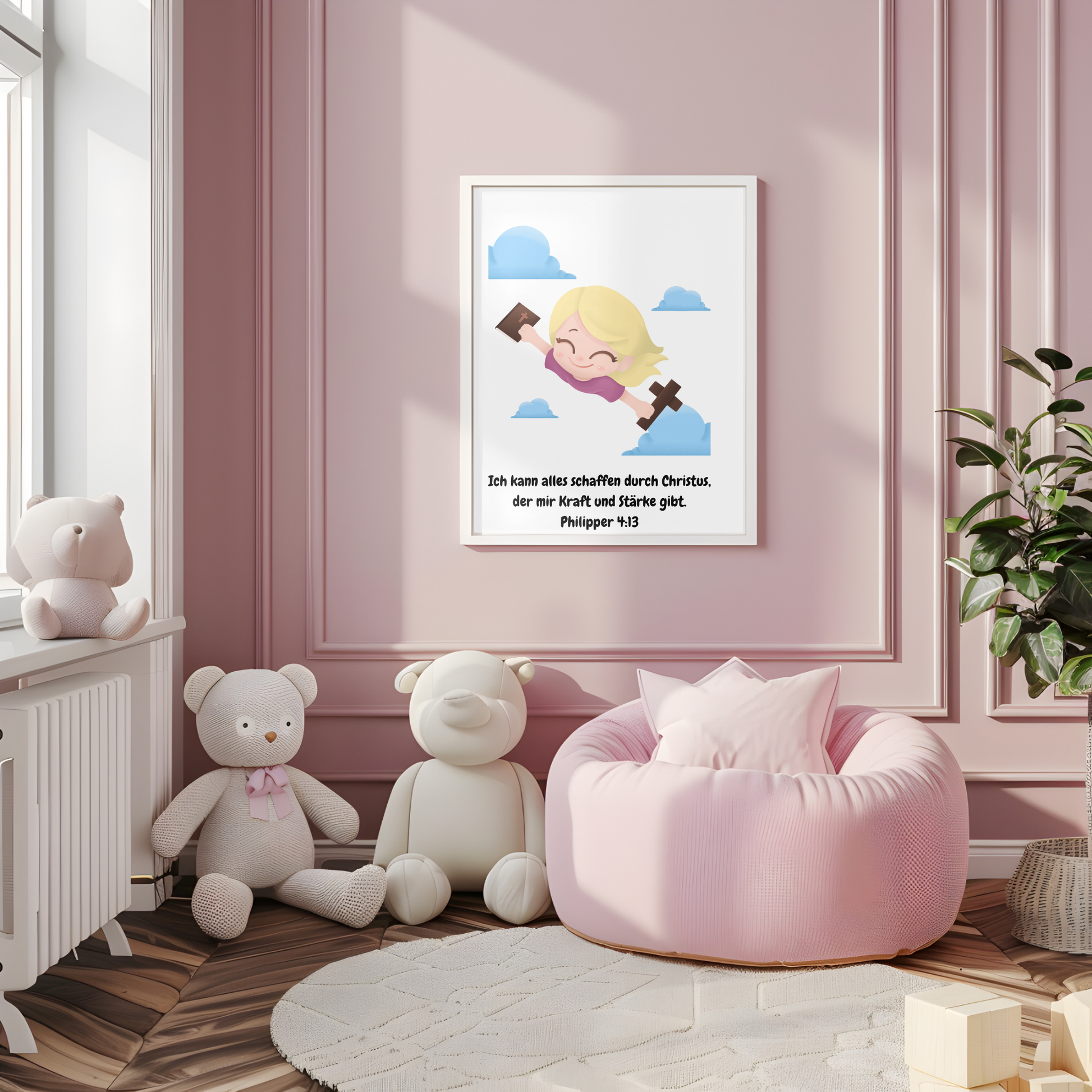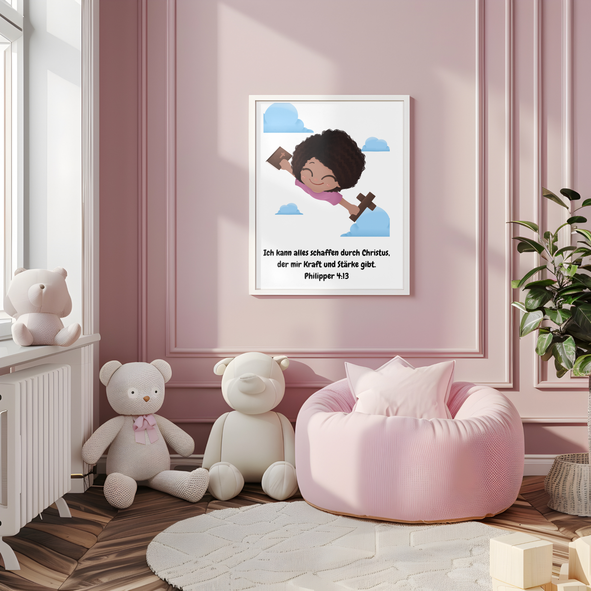 Dieses farbenfrohe Poster zeigt ein fröhliches Kind mit Bibel und Kreuz in der Hand, das durch die Wolken fliegt . Das Poster ist inspiriert vom ermutigenden Bibelvers „Ich kann alles schaffen durch Christus, der mir Kraft und Stärke gibt“ (Philipper 4:13). Ein kraftvolles Statement für kleine Herzen, das Mut macht und den Glauben im Alltag stärkt.